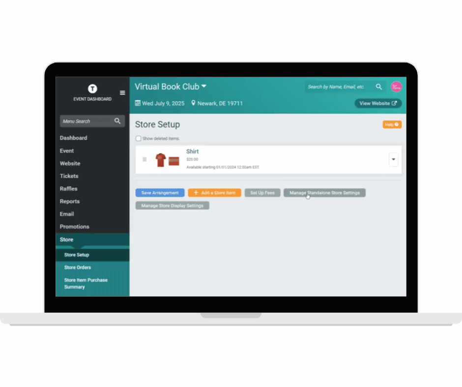 You can manage a store for your event through the Store tab on your event dashboard. To create a store item, go to Store>>Store Setup>>Add a Store Item.